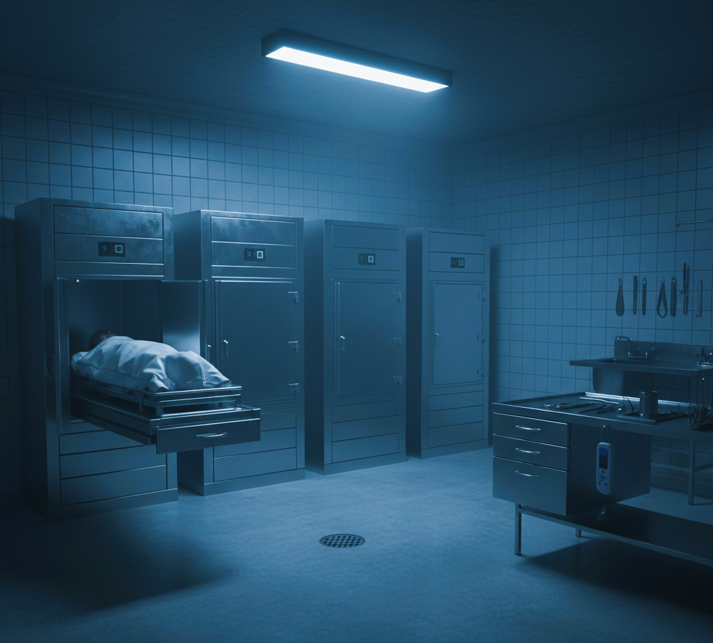 Entramos a la morgue y percibí el olor a formol característico de ese lugar, en el centro de la morgue había dos mesadas y sobre una de ellas un cadáver esperaba cubierto con una sábana blanca. Una luz lateral nos daba detalles de la escena.