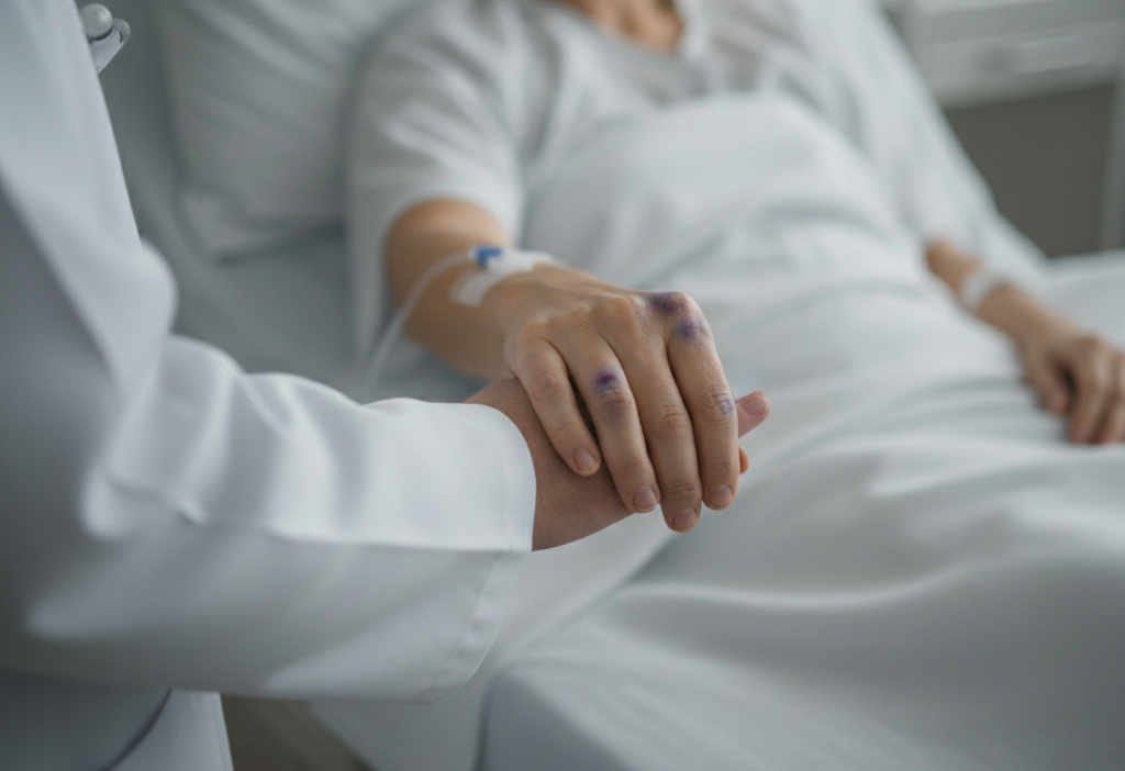 La verdad no pensé demasiado, me dirigí a la cama de la paciente a quien encontré en el lugar indicado. Me llamo la atención esa primera imagen, era una mujer muy joven, de tez blanca y cabello oscuro. El color de su piel era muy blanco, yo diría casi translúcida y tenía hematomas en diferentes lugares de su cuerpo. Muchos hematomas, algunos parecían recientes y otros eran azulados ya en franca resolución. Su semblante no era bueno.
